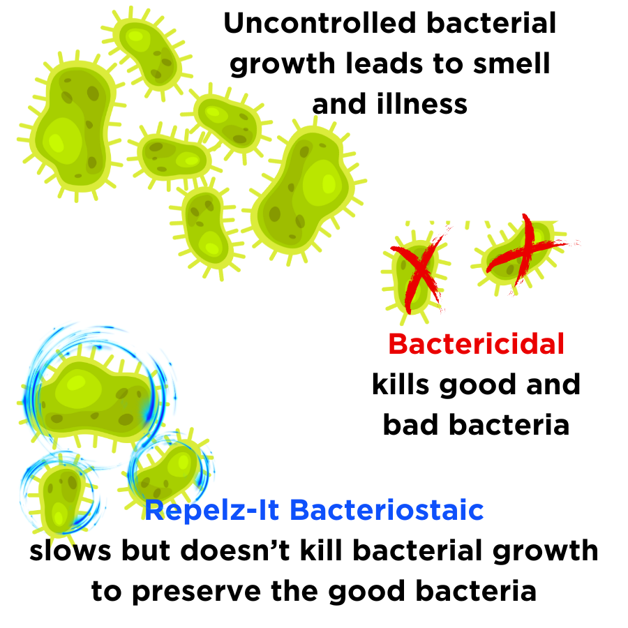 The most common pet odor is not produced by the animal but by the bacteria that attacks the natural oil in the animal’s coat. When this oil is transferred to a textile, the fabric itself acts as breeding ground for bacteria. Repelz-It contains a bacteriostatic that reduces the growth and spread of odor causing bacteria. Less bacteria, less odor.
