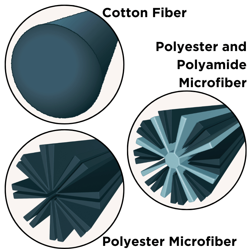 These tiny fibers work together like little fingers to grab and pull liquid, dirt, dust, and just about anything else from a surface. When a microfiber passes over a surface, these little fibers go into all the tiny cracks and bumps and scoop up everything that’s dirty. The more fibers a textile has, the more it can pick up. That’s why they’re better at cleaning than regular cloths or towels - they have a million little fibers each lifting and pulling away dirt. Like magic.